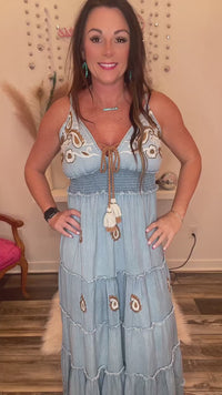 Long denim frayed ruffle long maxi dress with adjustable straps threaded and beaded paisley designs , rope tie ant bust for added detail , this dress is a one size fits most